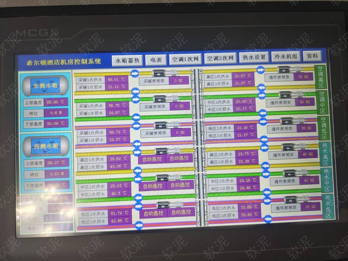 | 1. 項目位于秦皇島市海港區(qū)河濱路92號希爾頓歡朋酒店,功能包括谷電蓄熱(兩個續(xù)熱水箱)、谷電蓄冷(給消防水池降溫蓄冷)、熱水循環(huán)、空調水循環(huán)。 2. 蓄熱期間兩個蓄熱水箱各自溫控,蓄冷期間中央空調給消防水池降溫,只在谷電價格期間運行,節(jié)約電費。 3. 高區(qū)中區(qū)地區(qū),有各自的熱水循環(huán)泵和空調循環(huán)泵,水壓不同,各自的水循環(huán)系統(tǒng)獨立溫控。 4. 自動模式根據設定參數能自動啟停設備,手動模式可以直接操作每個設備啟停用于檢修。 5. 機房24小時有人值班,每人實名制賬戶,操作記錄自動存檔。設備分布在地下一層和地下二層的很多房間,通過軟泥物聯網平臺能夠統(tǒng)一管理,直觀的看到所有傳感器和水泵的反饋數據。 6. 所有功耗較大的設備都加裝的電表,進行電流檢測和耗電量統(tǒng)計,自動抄表,可檢索,數據可導出Excel文件下載。 |