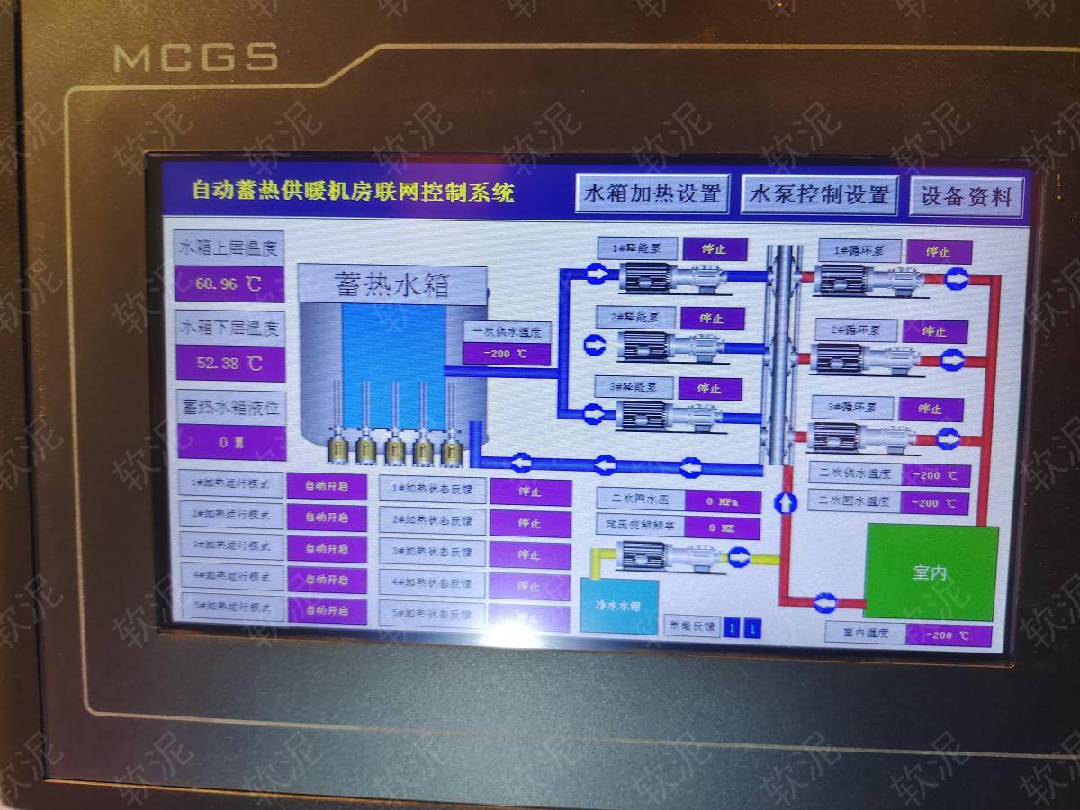 | 1. 項(xiàng)目位于承德市承德縣高寺臺(tái)鎮(zhèn)高寺臺(tái)村新民居小區(qū),冬季供暖系統(tǒng),夜間谷電價(jià)期間給大水箱蓄熱,二次網(wǎng)循環(huán)泵始終運(yùn)行,一次網(wǎng)循環(huán)泵通過(guò)間歇運(yùn)行,給板式換熱器升溫,維持二次網(wǎng)恒定溫度。白天不蓄熱,只釋放存儲(chǔ)的熱能,節(jié)約電費(fèi)。 2. 現(xiàn)場(chǎng)沒(méi)有人值班,通過(guò)手機(jī)軟件隨時(shí)可查傳感器數(shù)據(jù)。不限管理人員人數(shù),每人實(shí)名賬戶,自動(dòng)保存操作記錄。 3. 設(shè)備可選擇自動(dòng)模式,根據(jù)設(shè)定參數(shù)自動(dòng)啟停。也可選擇手動(dòng)模式,直接啟停每個(gè)設(shè)備用于調(diào)試檢修。 |